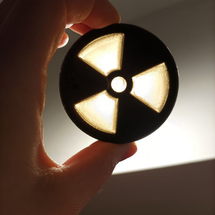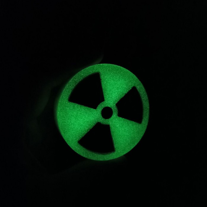 Круглий артефакт знак радіаційної небезпеки, котрий світиться в темряві.