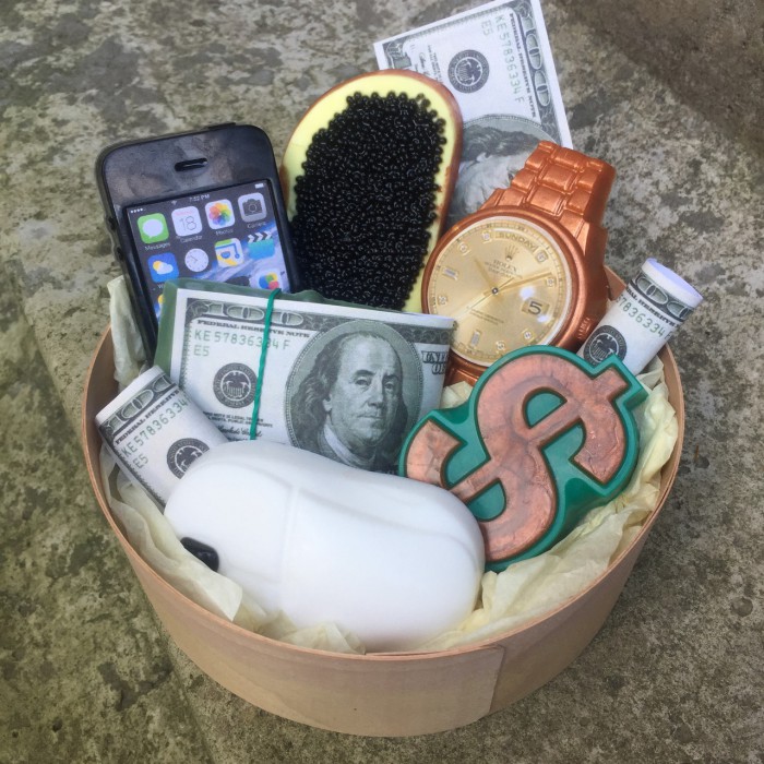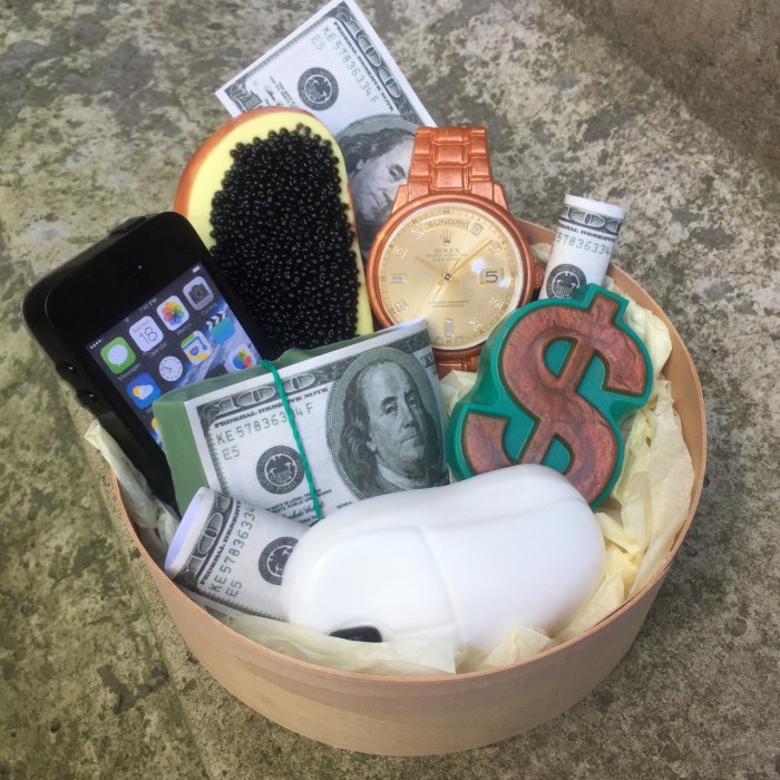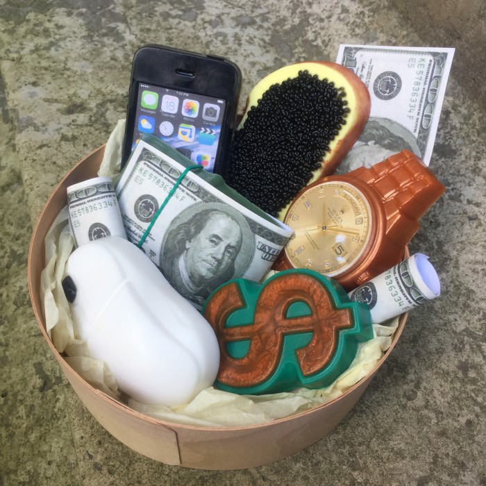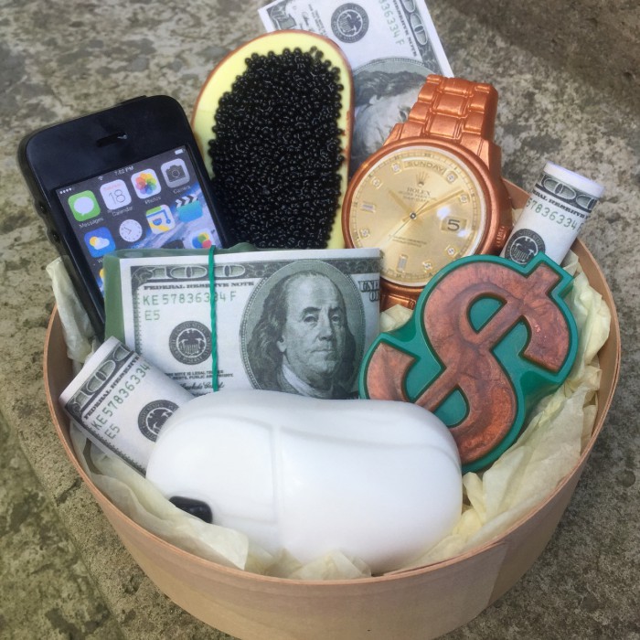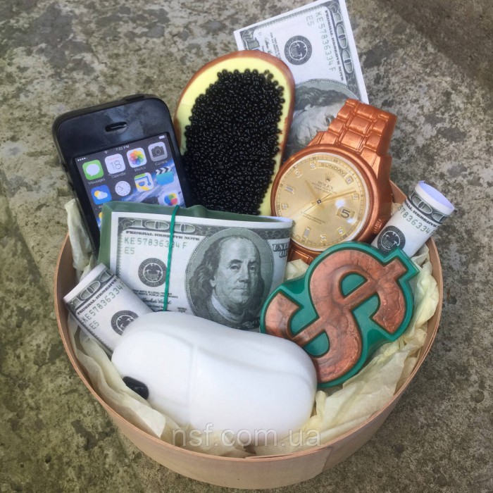 В набір входить годинник, айфон, бутерброд з чорною ікрою, пачка доларів, мишка, знак долар. Коробка зі шпону, композиція упакована в прозорий пакет з бантом.