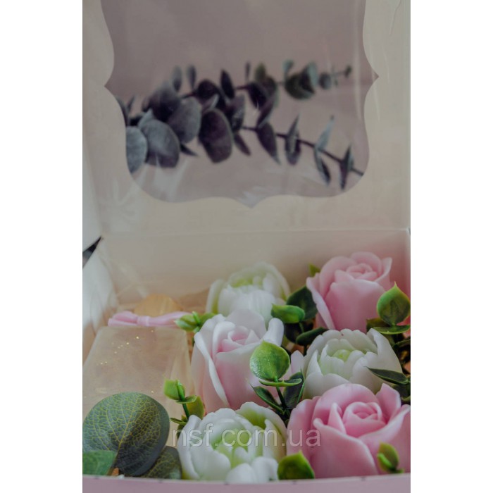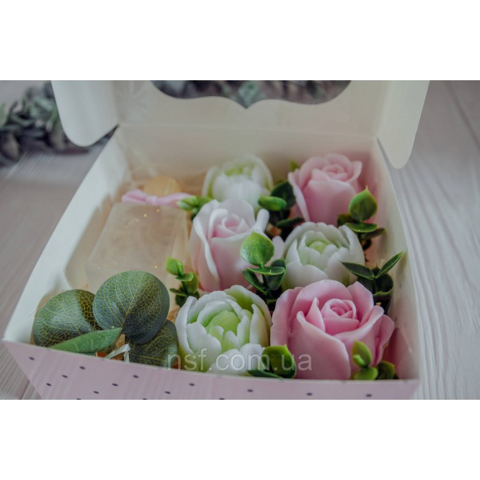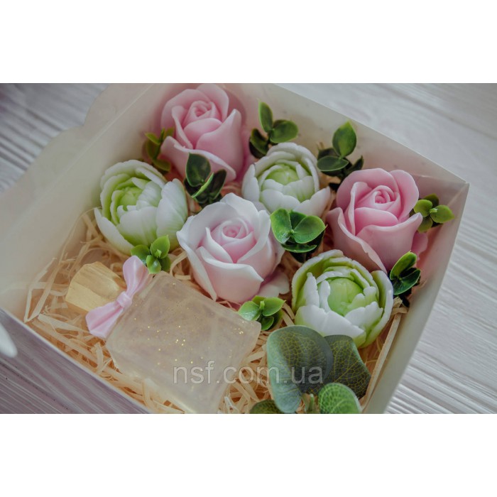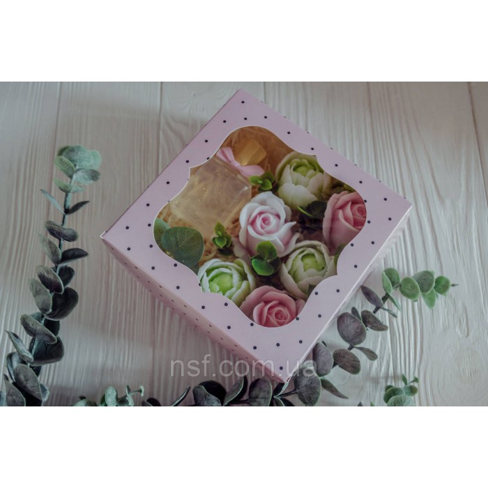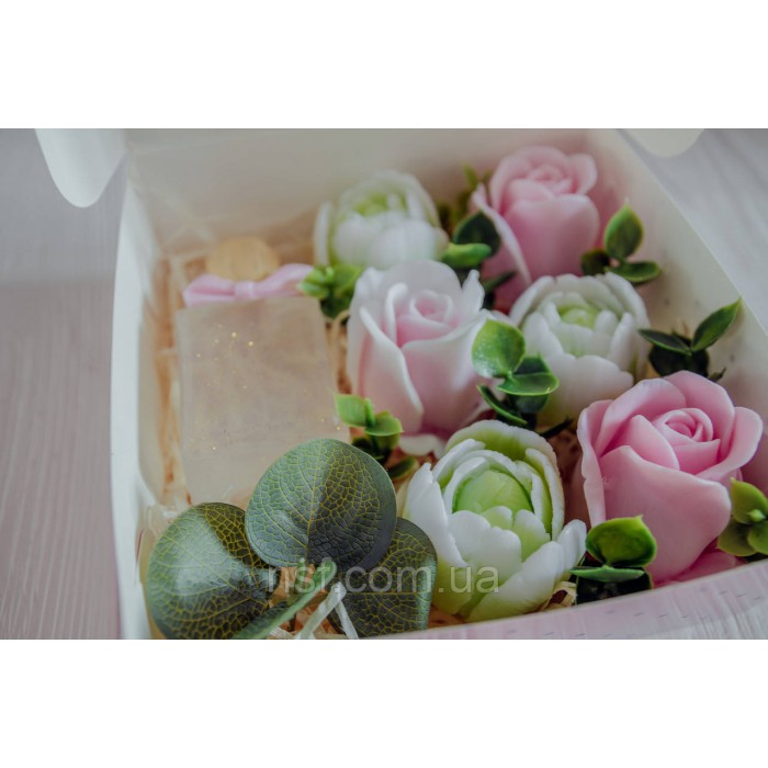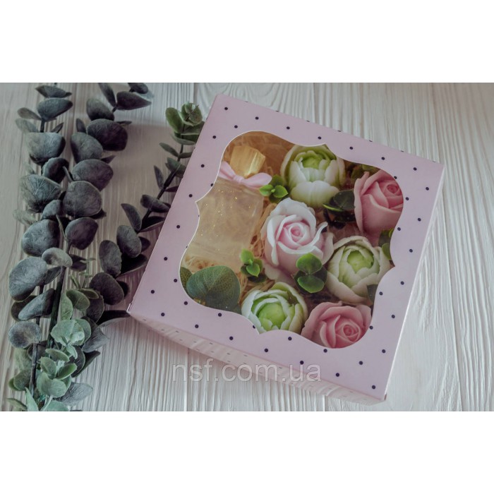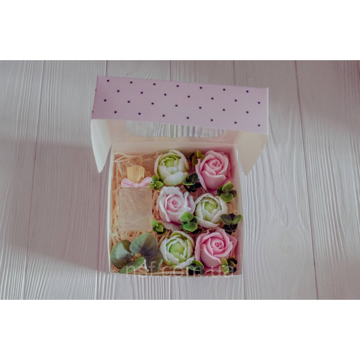 Подарунковий набір мила ручної роботи "Парфуми з трояндамими та тюльпанами" 15х15х6см